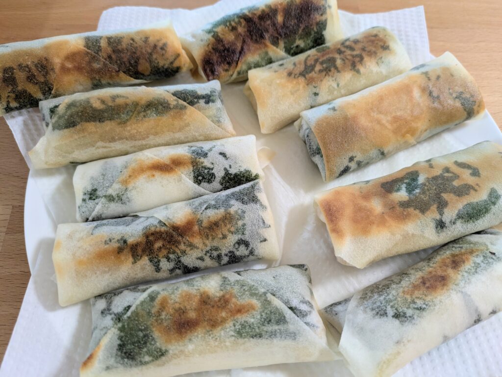さて出来上がりですが、きつね色になっていなくて白いですよね。油で揚げずに多めの油で炒めた結果、きつね色の美味しそうな春巻きにはなりませんでした。